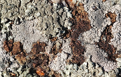 Rokkojäkälät ovat ruutuisia tiukasti kivialustassa kiinni olevia jäkäliä. Kotelomaljat punaisia. |